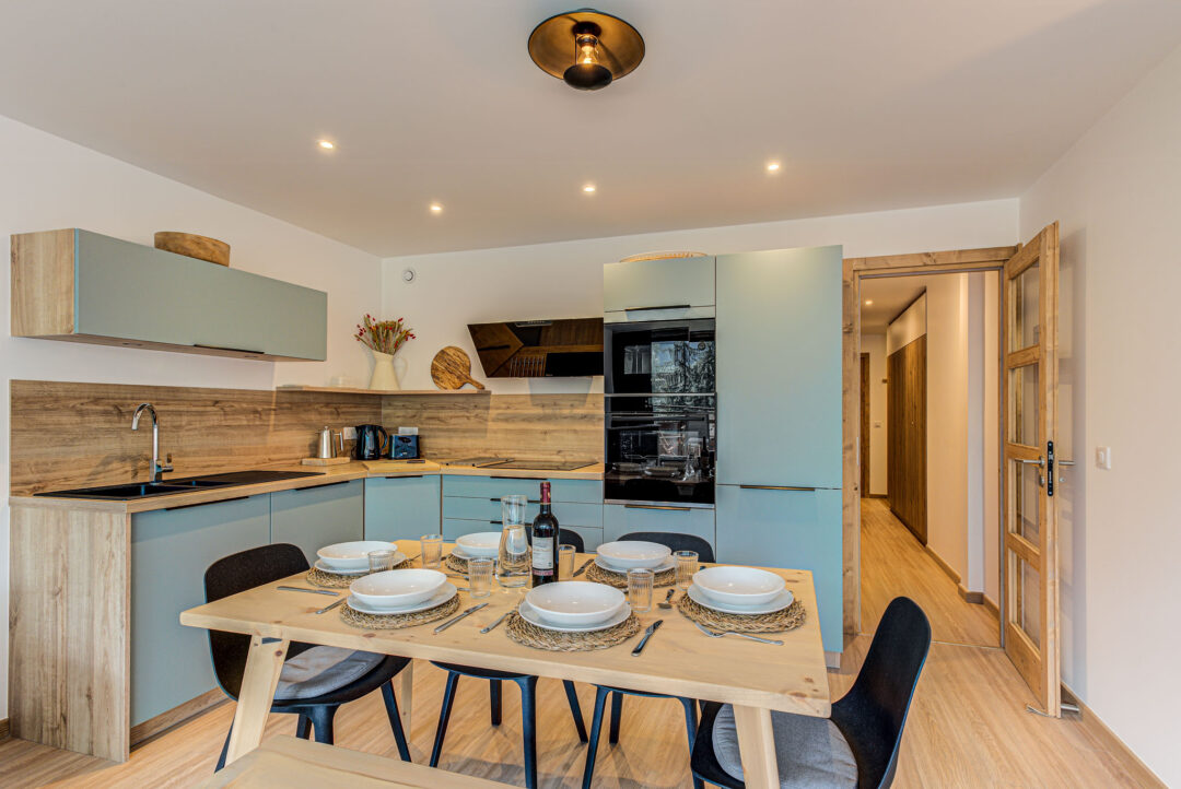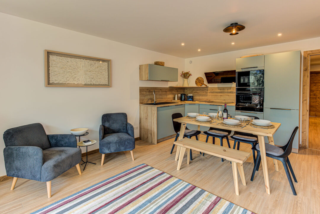 L’appartement Cristal des Glaces est situé au deuxième étage, accessible par un ascenseur et par l’escalier principal. Il comprend une généreuse cuisine/salon/salle à manger et trois chambres spacieuses à l’agencement flexible. Toutes les chambres disposent de nombreux placards et la chambre double principale dispose d’une douche en-suite. Une salle de bains supplémentaire se trouve dans le couloir principal, équipée d’un lave-linge, d’un sèche-linge et de toilettes. L’appartement dispose également d’un grand balcon orienté au sud, avec une table et des chaises pour les repas en plein air, et une vue imprenable sur les montagnes. Un parking souterrain sécurisé est disponible, ainsi qu’un parking en plein air supplémentaire, selon le principe du premier arrivé, premier servi, pour les personnes voyageant avec deux véhicules.