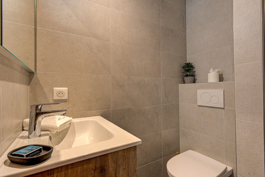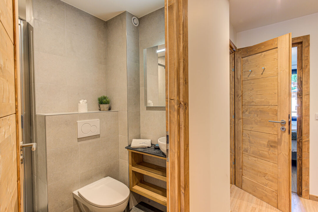 – Chambre principale : Lit double (160 x 200) avec douche et WC attenants.