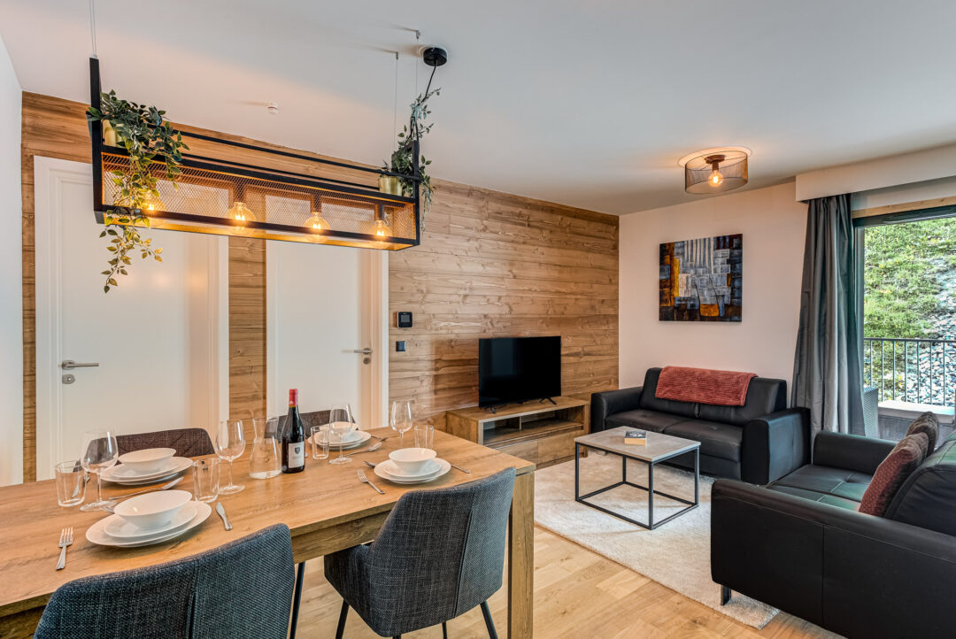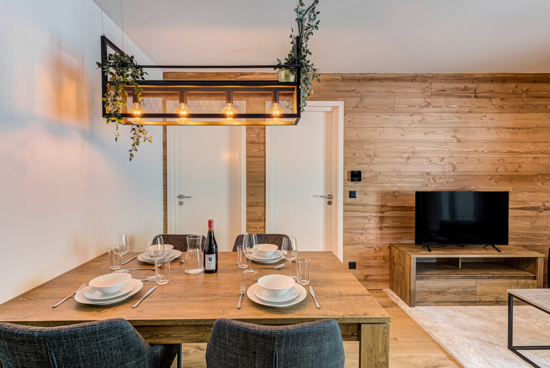The open-plan living, dining, and kitchen area provides a welcoming space to relax, complete with a comfortable sofa, TV, and a fully equipped kitchen with oven, stove, and fridge. Large doors open onto two generous balconies, where guests can enjoy stunning views of the Mont Blanc massif and the Aiguille du Midi.
