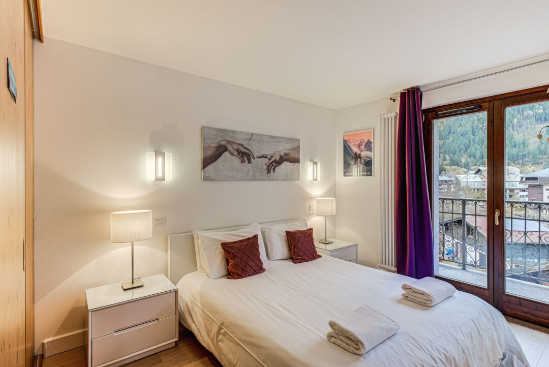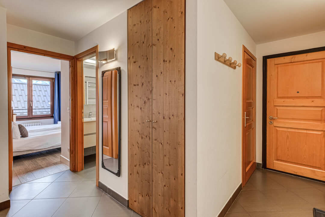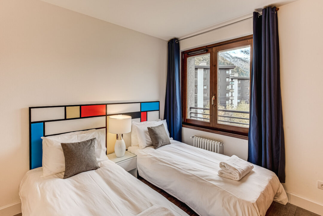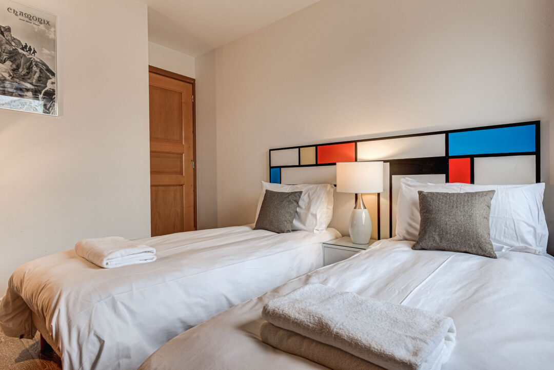 Alpes IV is a two-bedroom apartment designed for a comfortable stay of up to four guests. The master double bedroom opens onto a south-facing balcony, offering impressive views of the Mont Blanc range. The second bedroom provides flexibility, accommodating either twin or double configurations. Both rooms provide plenty of storage.