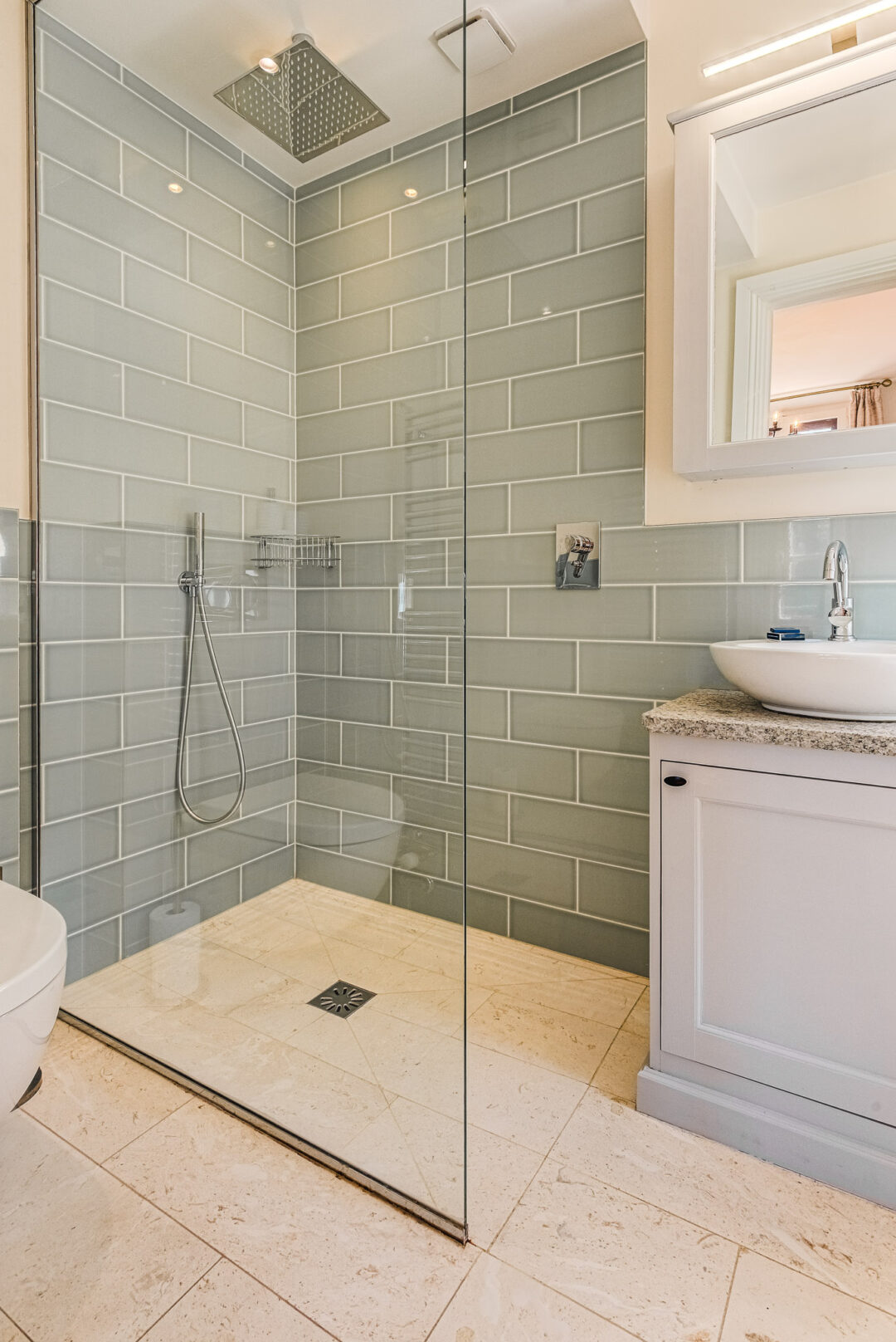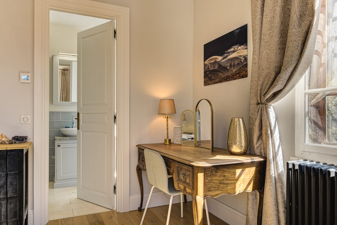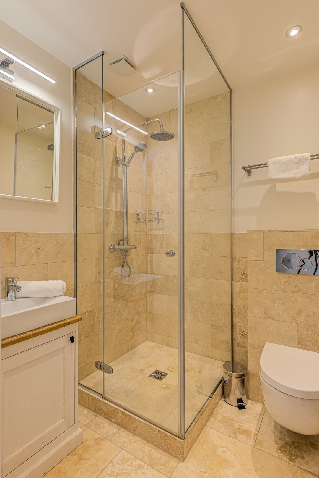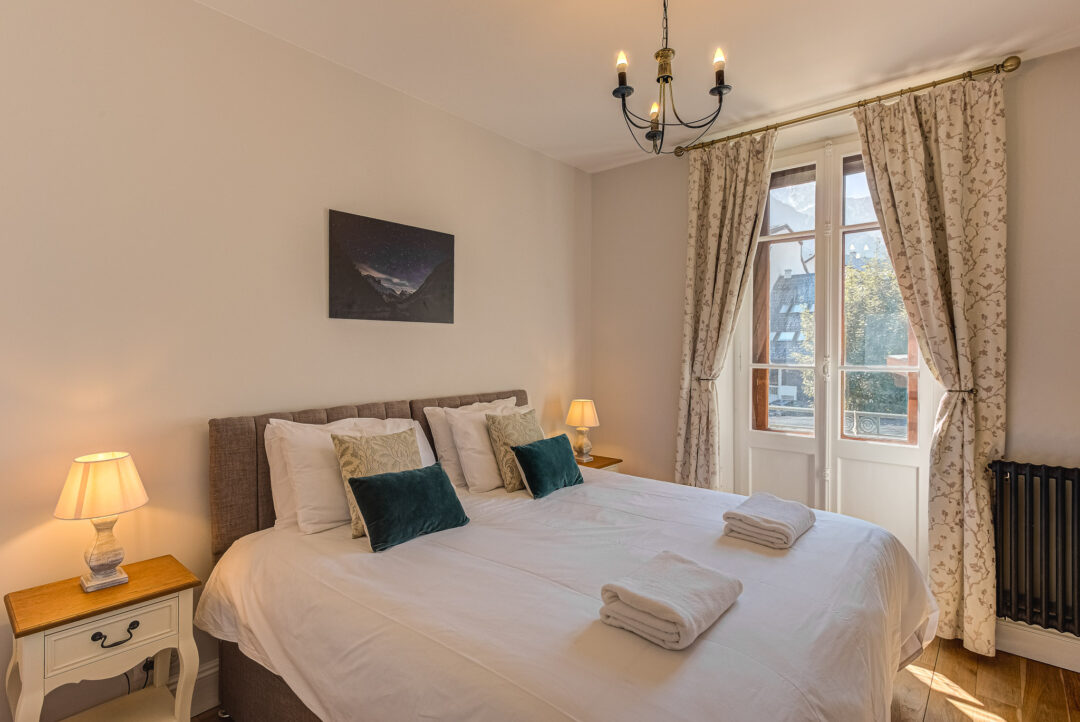 The stylish master bedroom boasts a King-size bed and an en-suite bathroom featuring a lavish cast iron roll-top slipper bath, WC, and a spacious walk-in shower. Enjoy a bath with a view as you gaze upon the summit of Mont Blanc and the Aiguilles du Midi. Every bedroom comes with its own balcony, and all en-suite bath/shower rooms feature delightful underfloor heating.