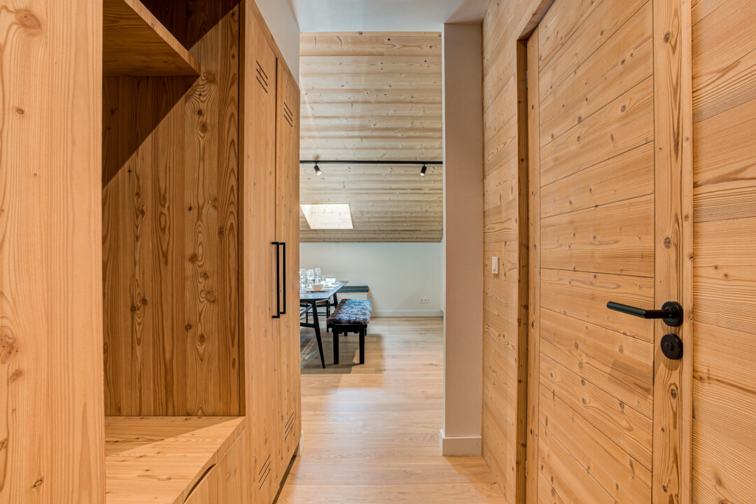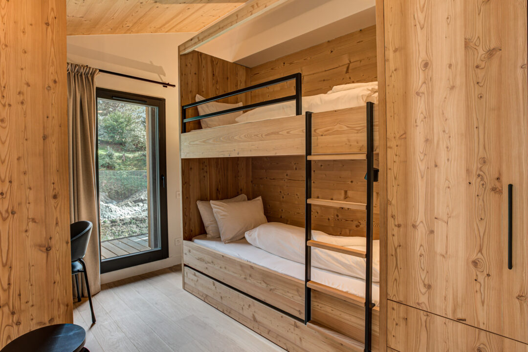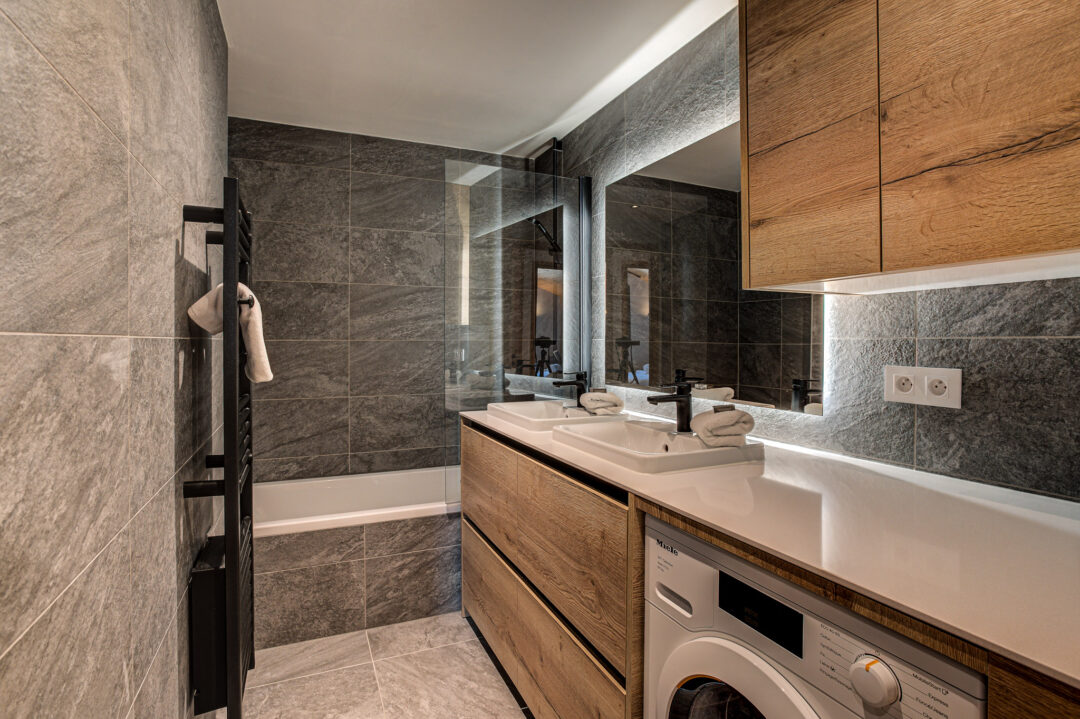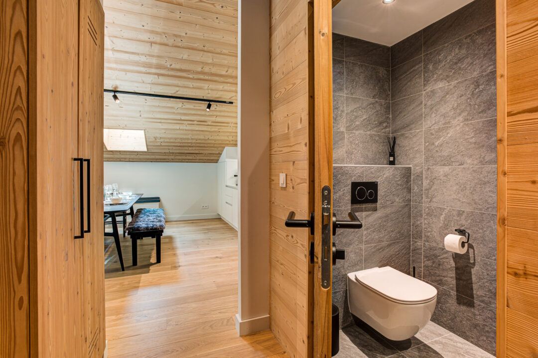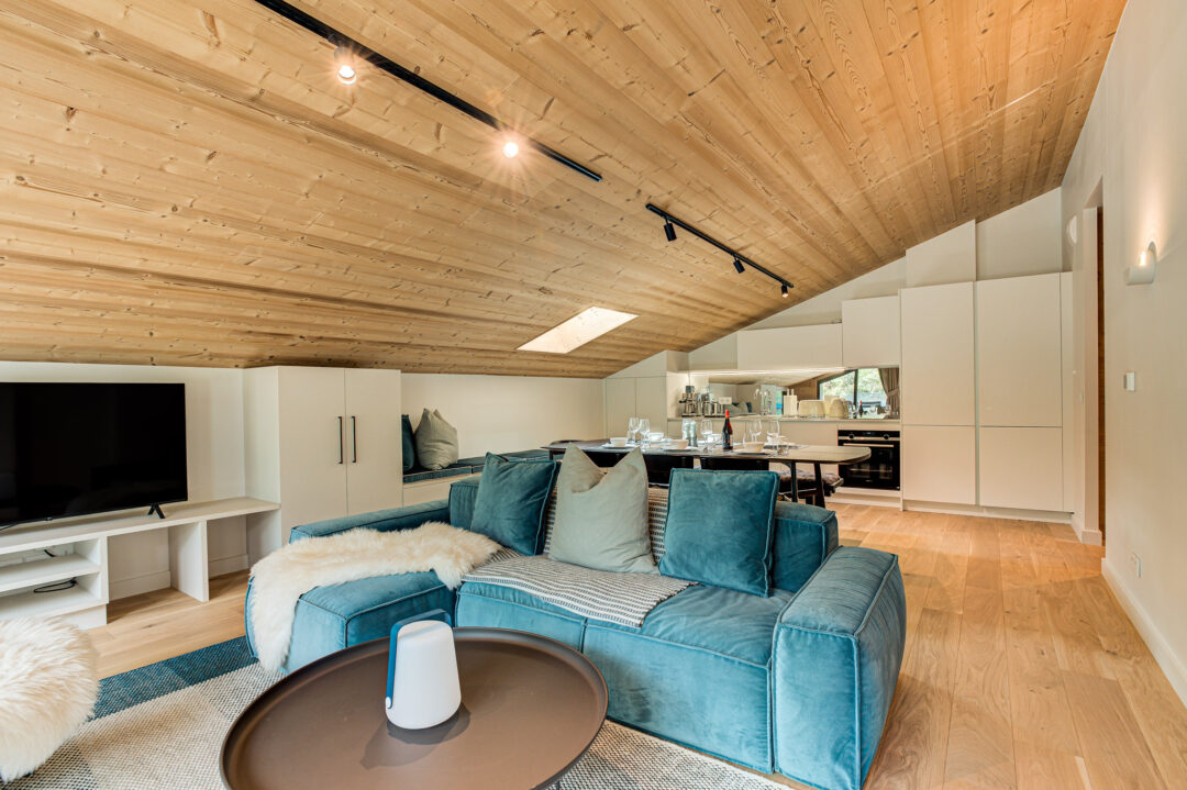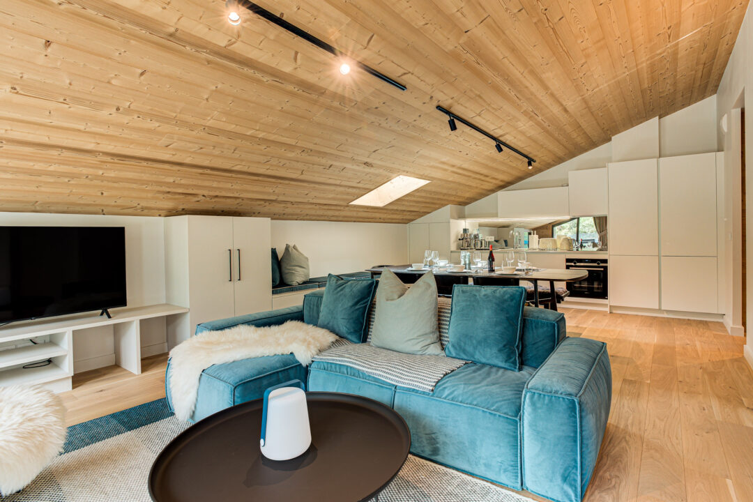 The apartment’s open-plan living space is ideal for socialising, with contemporary furnishings and large windows that flood the space with natural light. It is the perfect base for families and groups seeking both comfort and convenience in the heart of the Alps.