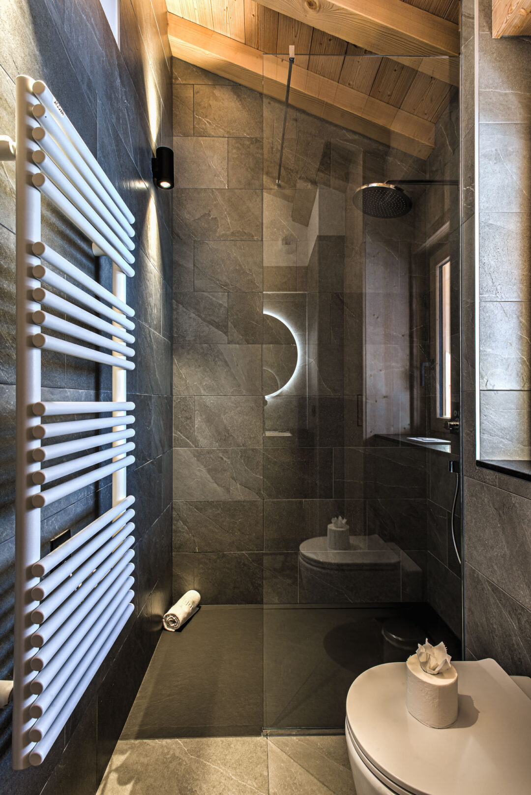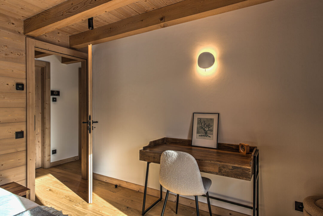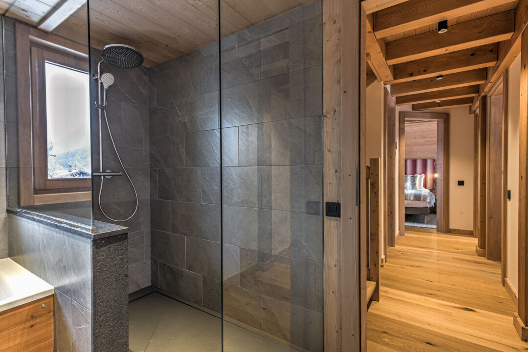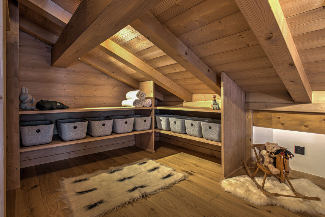 On the third floor, in the eaves of the chalet you’ll find a spacious room with three single beds. This room is the ideal cosy hideout for children and a quiet place away from the social part the chalet making it a great option for families with children of mixed age groups. This room has been decorated with children in mind, but can equally provide a functional space for larger groups looking to maximise the capacity of the chalet.