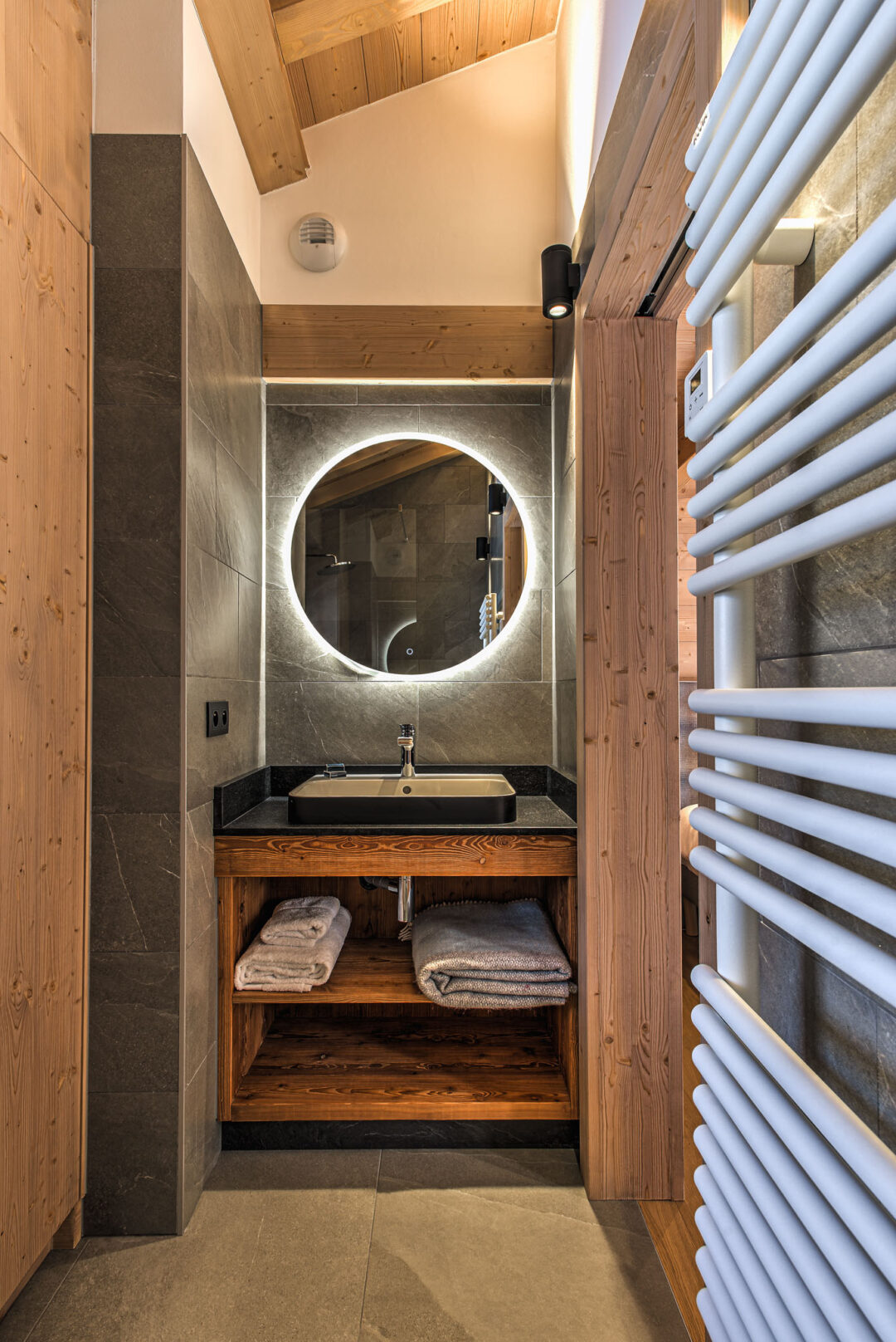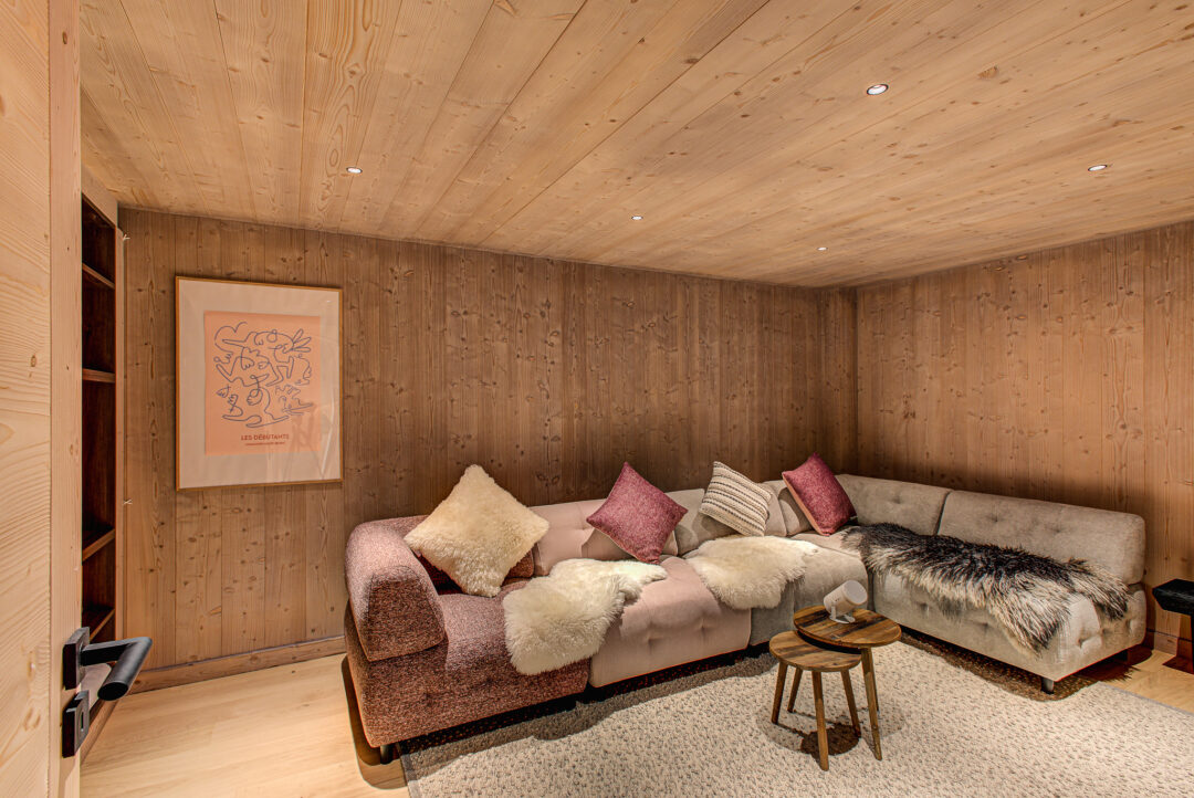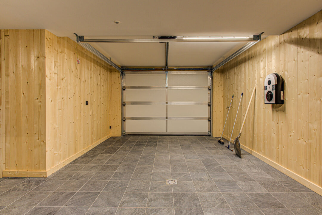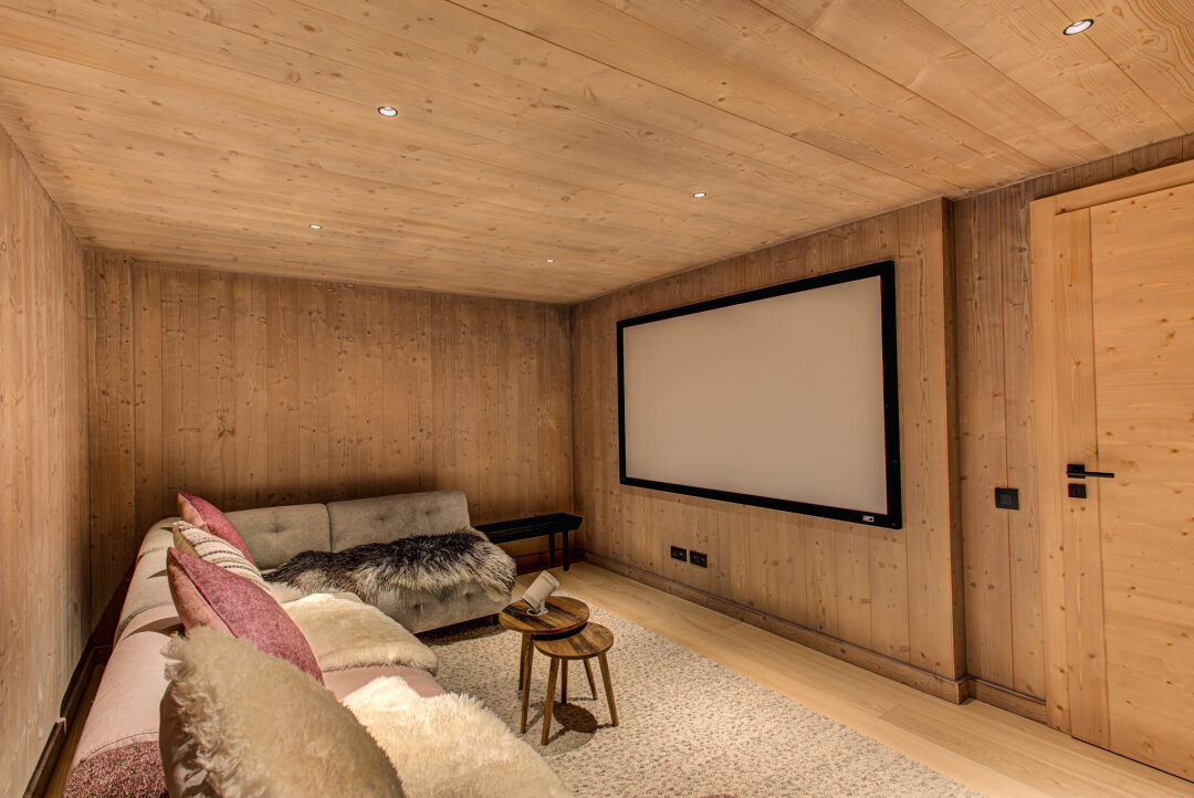 The chalet spans four floors. Upon entering the ground floor, you’ll find a large private garage equipped with an electric vehicle charging point, boot dryers, and ample space for storing skis and bikes. This level also features a convenient laundry room with a washer and dryer. Additionally, the ground floor includes a spacious cinema room with a wireless projector, ideal for evening entertainment after an active day on the mountain.