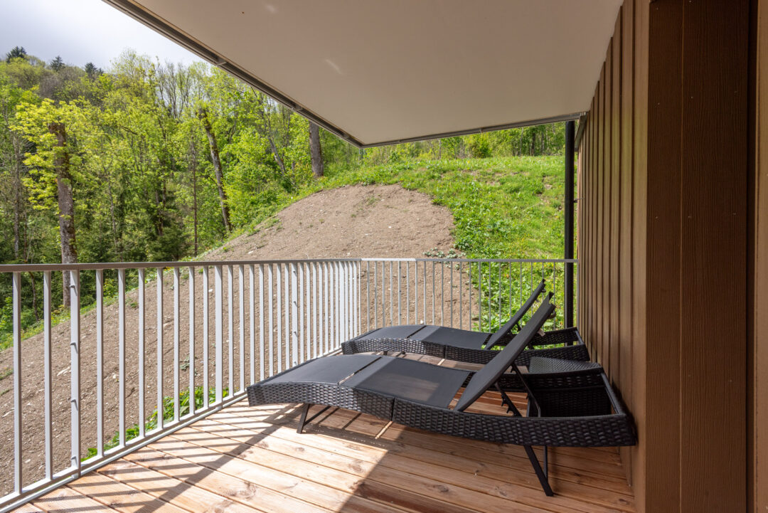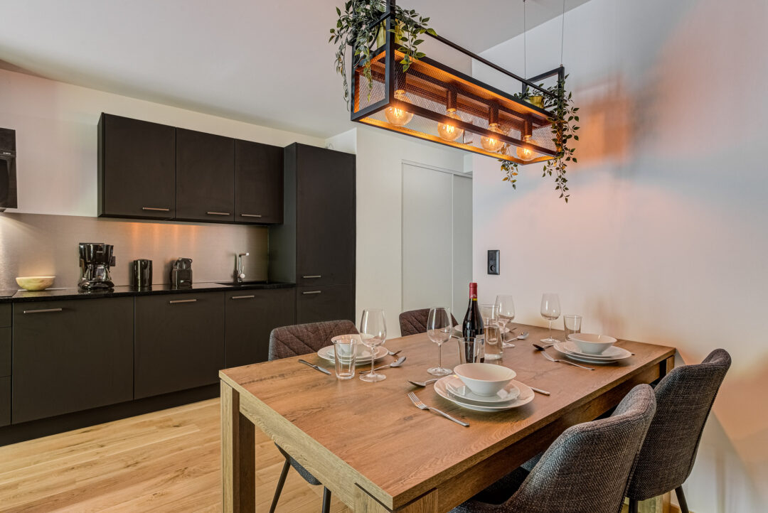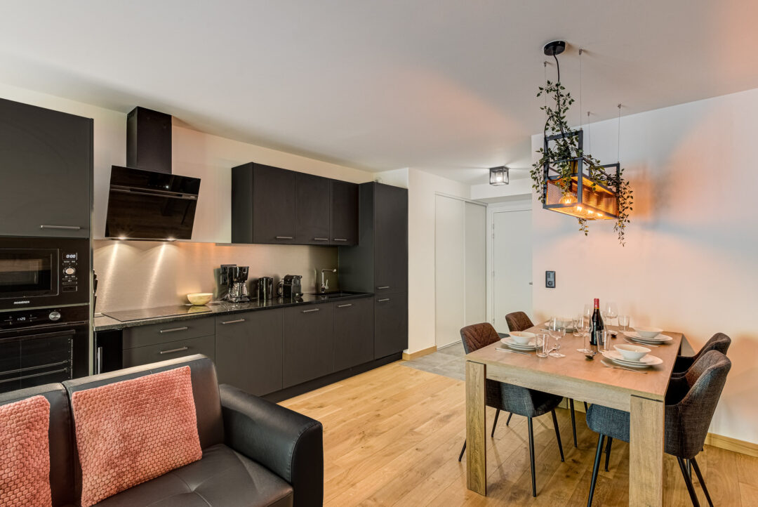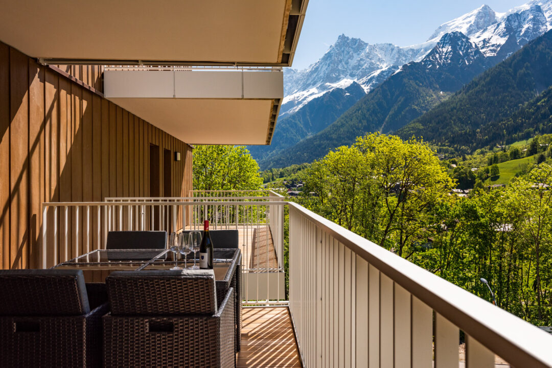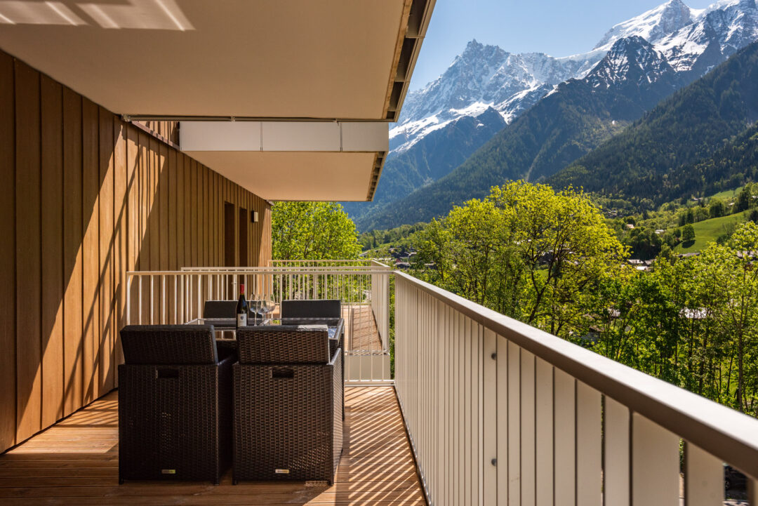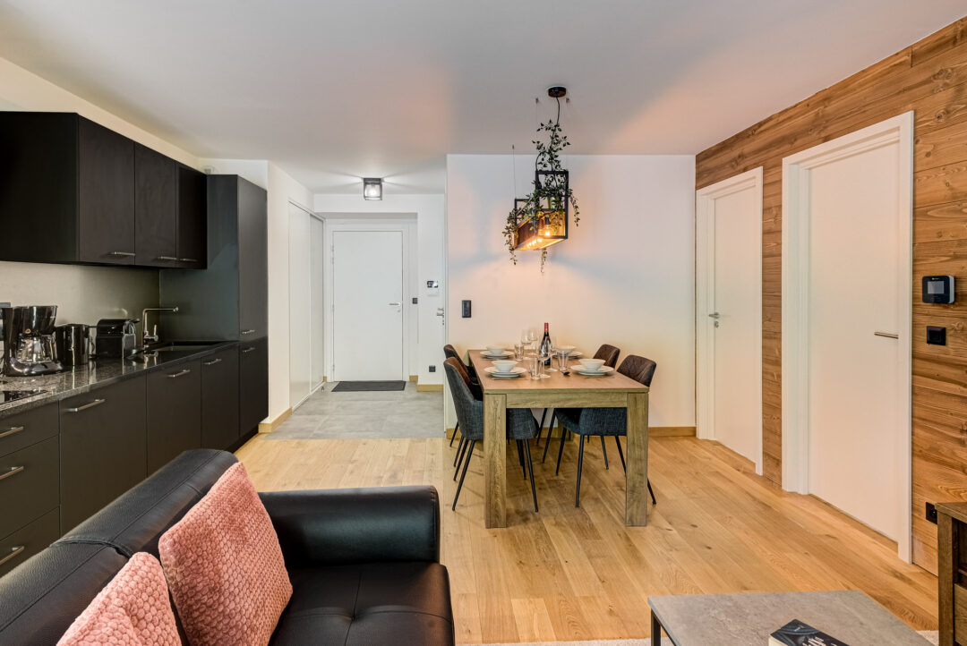 The open-plan living, dining, and kitchen area provides a welcoming space to relax, complete with a comfortable sofa, TV, and a fully equipped kitchen with oven, stove, and fridge. Large doors open onto two generous balconies, where guests can enjoy stunning views of the Mont Blanc massif and the Aiguille du Midi.
