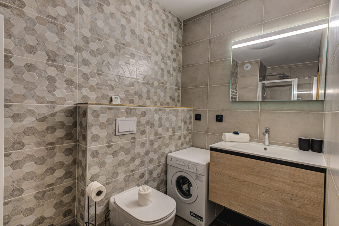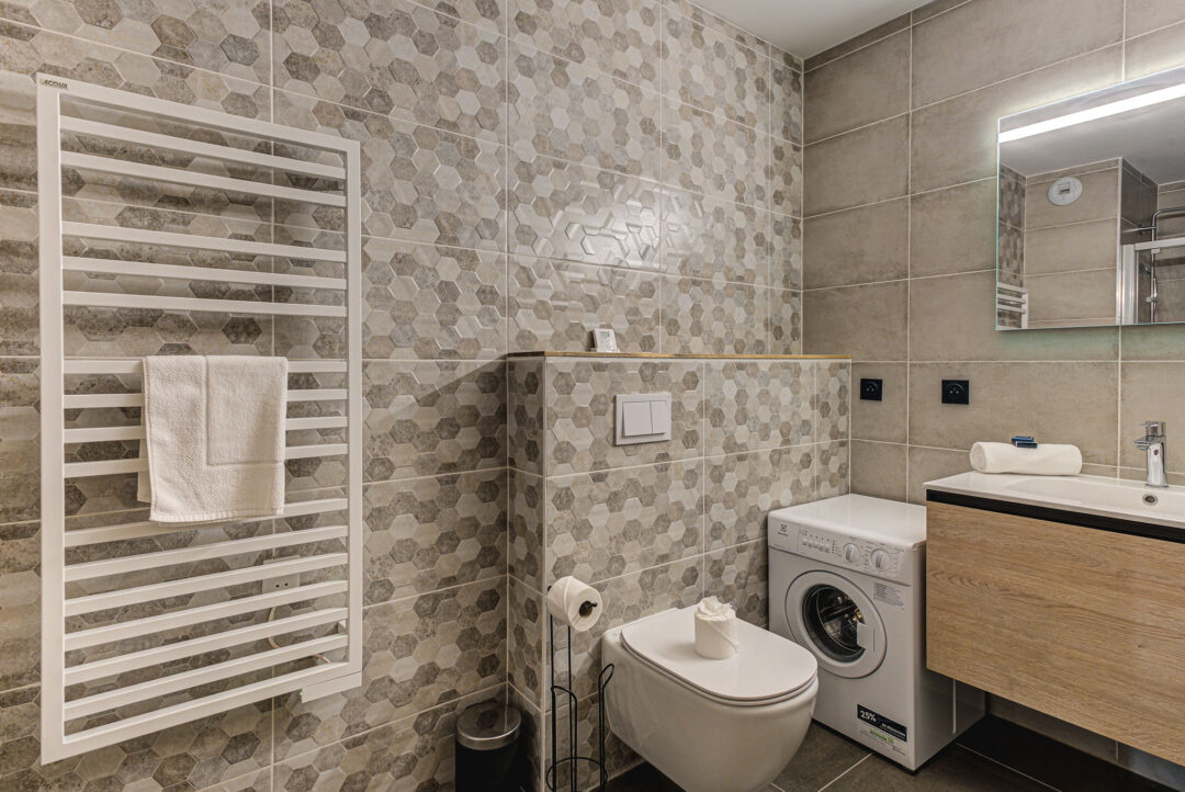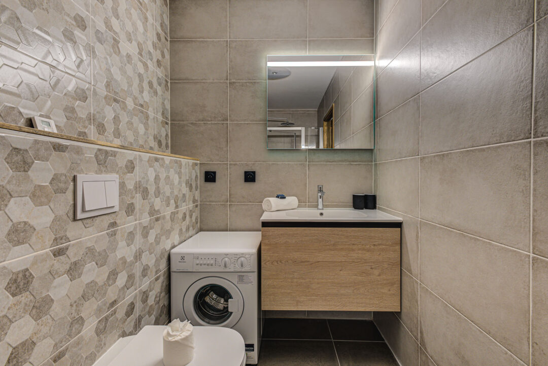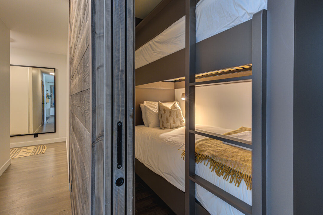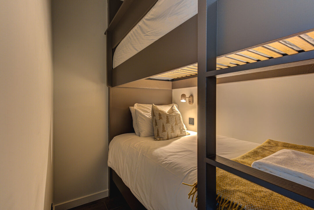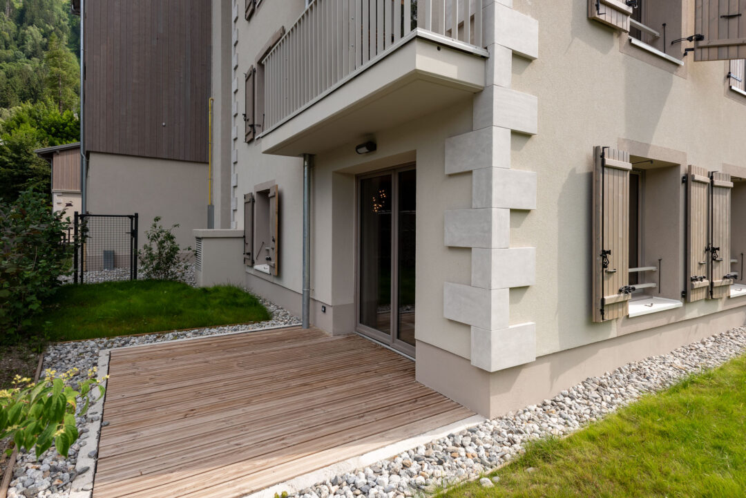 Apartment White Pearl A05 is a a high-end apartment located in a modern building in Chamonix. With its convenient location just a few minutes away from the town centre, this apartment combines location, comfort, and style. The apartment features one bedroom along with an additional cabin space with bunk beds and a sofa bed, providing sleeping for up to 6 guests. The professional interior design provides a contemporary and fresh style that doesn’t compromise on comfort. Situated on the ground floor, this apartment comes with an outdoor patio area – a great spot for meals outdoors or just enjoying the view. It also has plenty of storage space and an underground garage.